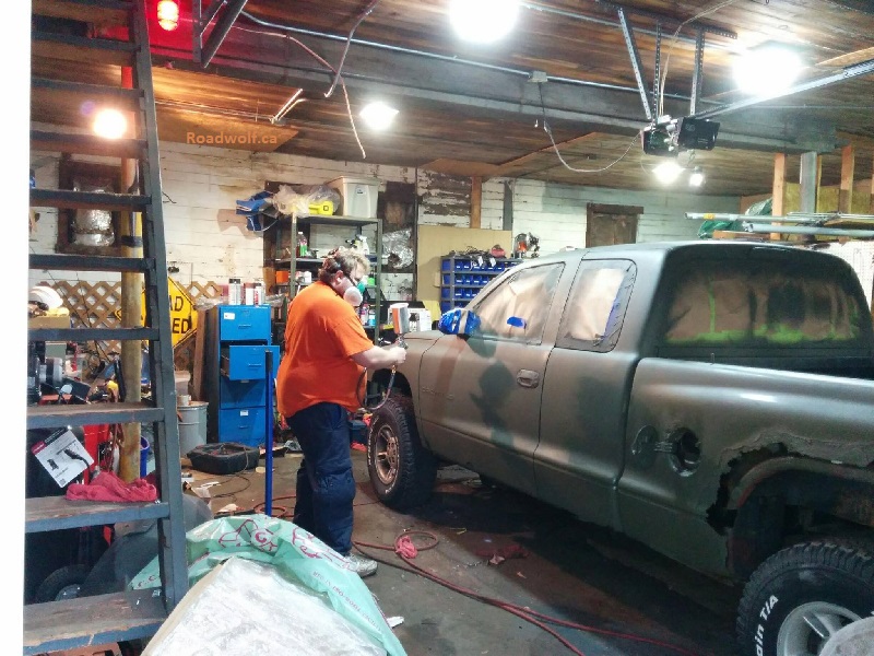 In October 2016 I had installed the 'new' fenders. My friend Jacob and I then taped up the windows and all the parts of the truck I didn't want to get painted. It was now time to apply the Army Green paint! This is the first time I have ever painted a whole vehicle with a proper paint sprayer. I had purchased a SCBA for this process specifically.